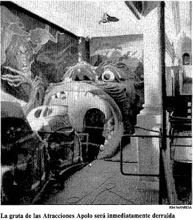 El Raval siempre ha sido un barrio con muy pocos parques públicos o espacios donde los niños y los mayores puedan jugar o pasear. En las fronteras del barrio, al otro lado del Paralelo, en la esquina con Nou de la Rambla (en aquella época llamada Calle del Conde del Asalto), cuando yo era pequeño se encontraban las "Atracciones Apolo" (hoy desaparecidas bajo la piqueta especulativa y la construcción de un inmenso hotel), aunque a finales de los años 70 estaban en franca decadencia, con unas instalaciones cada vez más degradadas. Se trataba de un parque de atracciones de reducidas dimensiones, pero que tenía una famosa Gruta a la que se accedía, con vagonetas en forma de dragones, a través de una inmensa boca de monstruo.